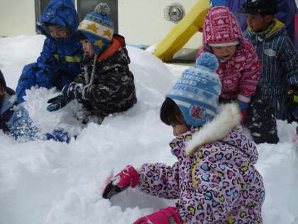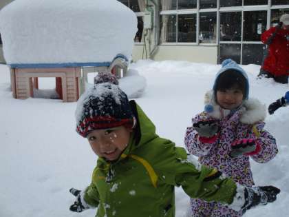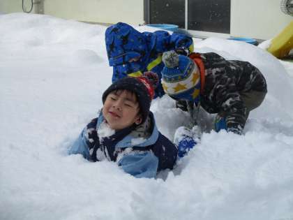 雪がたくさん積もって大喜び!深く積もった雪の中をはうように進んだり、寝転がったりして楽しかったです。サラサラな雪をすくい、上に投げて雪だらけになって大笑い!また、雪遊びしましょうね。