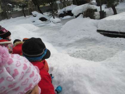 園庭でも雪遊びをしました。雪の滑り台でソリ遊びをしたり、かまくらをつくったりしました。雪の上を「沈まずに歩けるよ」と楽しみながら歩いていました。