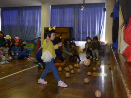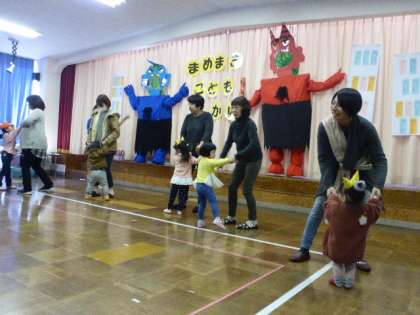黄色のつのを付けたちびっ子たちが、豆まきに参加しました。お家の人とダンスをしたり、歌を歌ったりして遊びました。鬼の的あても楽しみました。