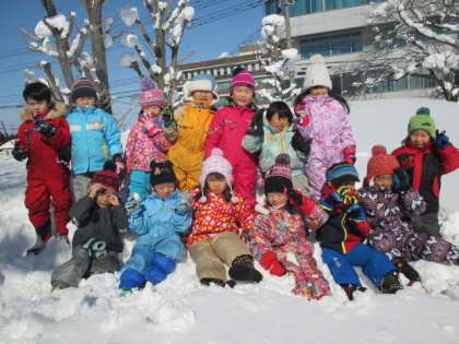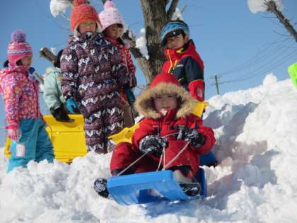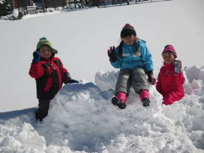 今日はぽかぽかと暖かい日になりましたね。「やったー!雪遊びだ!」と子供たちは大喜びで外へ駆け出していきました。昨日の大雪で小学校のグランドは子供たちの腰ぐらいまでの積雪に…足を取られながらも、築山に向かって頑張って歩いて行きました。築山の雪を踏み固め、ソリのコースを作って何度もソリ遊びを楽しむ子、新雪の上に飛び込み、お日様を浴びる子、雪をかき集め雪だるまや船を作る子など、それぞれが思い思いに雪遊びを楽しんでいました。「また遊びたい!」と雪遊びを楽しみにしている子供たちです。