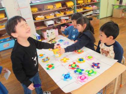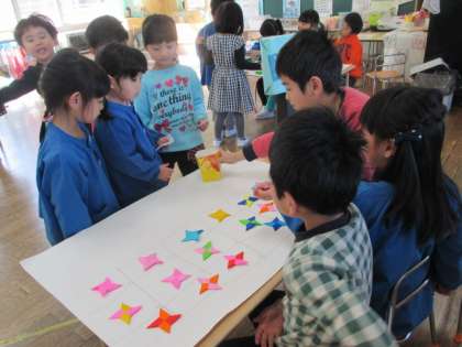 子供たちが遊びの中でつくってきた、折り紙の製作をくじ引き屋さんにして遊びました。小さいクラスのお友達やお別れ会に来てくださったお家の方にお客さんになってもらい楽しみました。