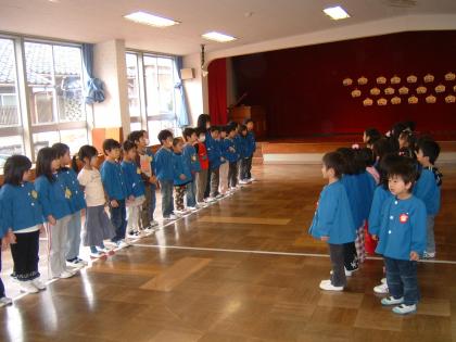 ゲーム大会の後は、お別れ会です。「お別れ会の歌」を歌うと幼いながらもしんみりと別れの寂しさを感じ合ったひとときでした。プレゼント交換では、年少・年中さんから年長さんに手作りの「鉛筆立て」「写真立て」を、年長さんからは手作りの「キーホルダー」が贈られました。どれも手作りの気持ちのこもった小物です。大切に使いましょうね。