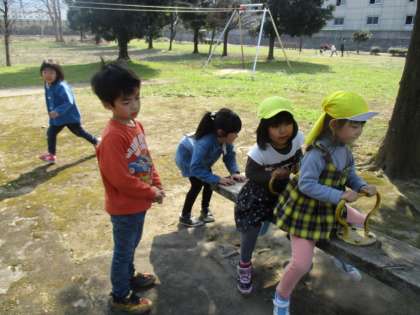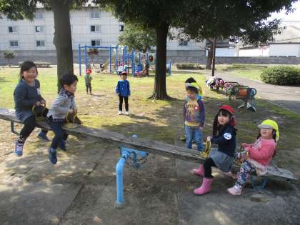 年長組さんと一緒に公園に行ってきました。シーソーが動かないとき、シーソーの後ろを押してくれてありがとう!一緒に鬼ごっこをして楽しかったね!ドングリや草花を見つけたね!一緒に手をつないでくれてありがとう!