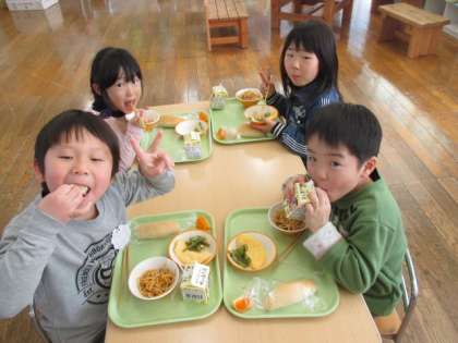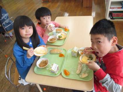 今日はうさぎぐみにとっては幼稚園最後の給食でした。小学校の給食室から運ばれてきたワゴンには、なんと給食の先生からメッセージが!!「小学校へ行ってもたくさん食べて、大きくなってね」と書いてあり、子供たちはとても大喜び。みんなでおいしく味わって食べました。