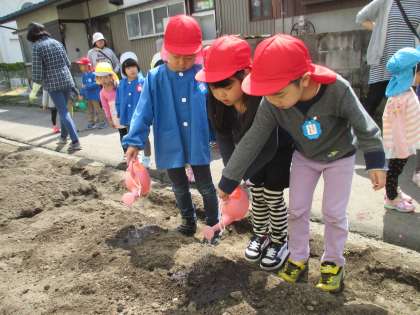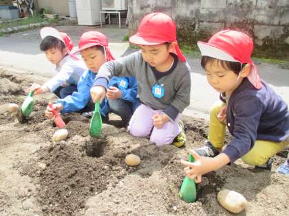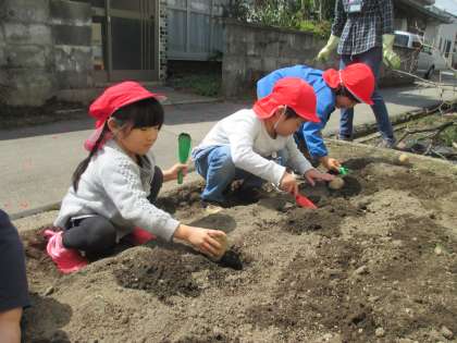 草をむしって、石を拾って、土を耕して作った自分たちの畑にじゃがいもの種芋を植えました。種芋が入る部屋を作って(穴を掘る)入れ、布団(土)をかけて眠らせ「おいしくな〜れ!」とおまじないをかけました。種でもなく、苗でもなく、芋そのものを植えることにびっくりしていた子供たちでした。