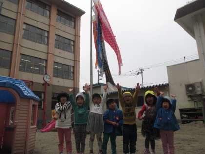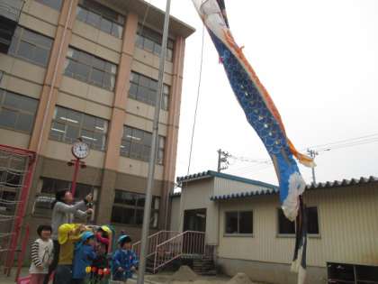 5月の節句を控え、今日はみんなで園庭にこいのぼりを揚げました。「お父さん大きい!」「これお姉ちゃんだ!」と間近で見るこいのぼりに興味深々。よいしょよいしょの掛け声でひもをひっぱると、空に向かってどんどんこいのぼりが高く上がっていきました。風が吹くと一斉にこいのぼりが揺れ「家族みんなで泳いでる!」と子供たちは大喜びでした。「お歌を歌うともっと揺れるかも!」と大きな声で歌を歌うかわいい子供たちです…