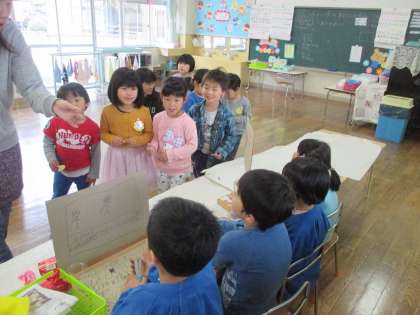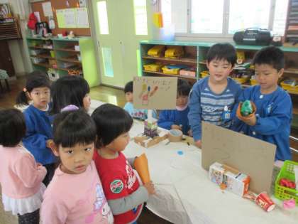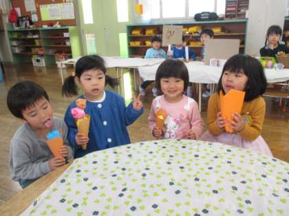 うさぎ組さんがチケットを手に「アイスクリーム屋さんに来てくださ〜い!」と誘いにきてくれました。たんぽぽ・ひまわり組の子供たちは大喜び。さっそくチケットを持って2階に上がりました。お部屋に入ると、色とりどりのアイスクリームがいっぱい!「いらっしゃいませ!」「これはカルピス味ですよ」とうさぎ組さんが張り切って声をかけてくれました。「チョコのアイスください」「これは何アイスですか」とやりとりしながら、何度もいろいろなアイスをもらって嬉しそうな子供たちでした。