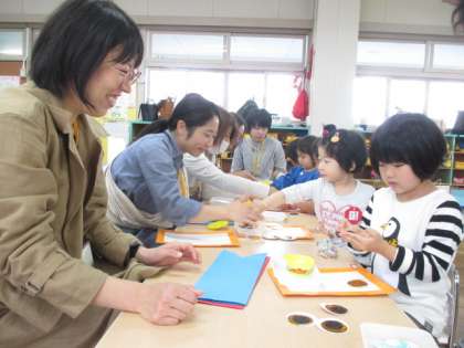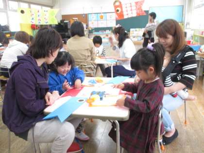 今年度初めての保育参観がありました。登園してから好きな遊びを楽しみ、その後おうちの方と一緒にこいのぼりの製作をしました。たんぽぽ・ひまわり組は目玉を組み合わせて貼り、クレヨンでぐるぐるお絵かきしたり、はじき絵をしたうろこをこいのぼりの体に貼りました。うさぎ組は切り込みが入った体に細長い色画用紙を編み込み、素敵な模様のこいのぼりに仕上がりました。子供たちはおうちの方と活動できてとても嬉しそうでした。