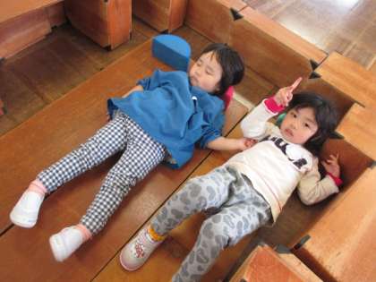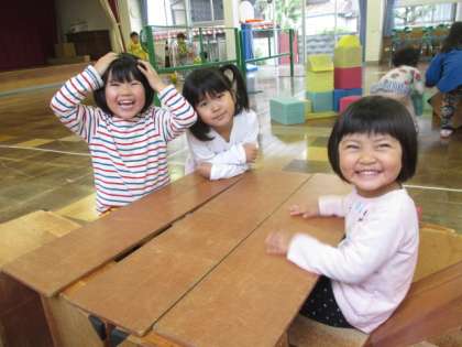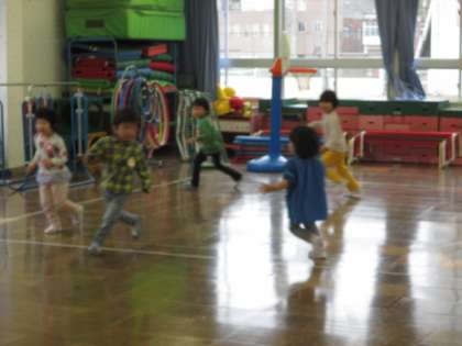 体を動かすのが大好きな子供たち。遊戯室に集まって、みんなで何をして遊ぶか相談し、最初に鬼ごっこをしました。みんな真剣な表情で逃げたり追いかけたりを楽しんでいました。その後、サッカーをしたり大型積み木で大きな家を作り、ベッドやお風呂、テレビの部屋などを作って、楽しく過ごしました。