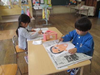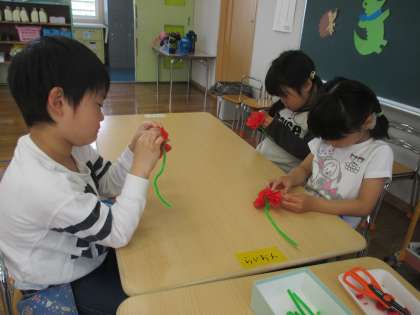 大好きなお母さんへのプレゼント作りをしています。「私のママは髪の毛長いよ」「僕のママはかわいいよ」と話をしながらお母さんの顔を描いていました。カーネーションの花も作りましたよ。お楽しみに。
