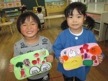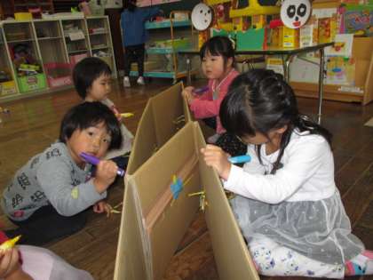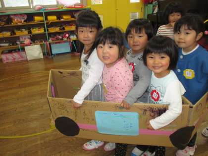 子供たちは、お家の方と一緒に行く遠足をとても楽しみにしています。そこで、お家の人と一緒に食べるお弁当をつくったり、リュックをつくったりしています。今日は、段ボールでバスをつくって遊びました。自分たちでつくったバスに乗っていろいろな所に出かけています。「明日は、動物園に行こう」と、遠足ごっこを楽しんでいます。