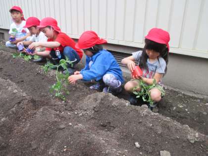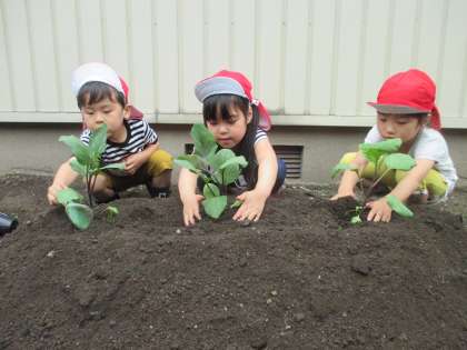育ててみたい夏野菜を選び、一人一苗、トマトやキュウリ、ナス、ピーマンを畑に植えました。「おいしくな〜れ」と何度もおまじないをかけていました。おいしい野菜が収穫できるよう水やりや草むしりなど世話をしていきたいと思います。