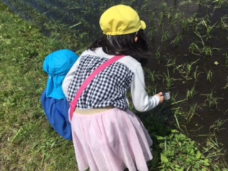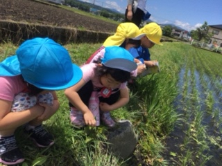 今日はオタマジャクシを探しに、近くの田んぼまで散歩に出かけました。田んぼをそうっと覗いてみると、大きいオタマジャクシや赤ちゃんオタマジャクシがいっぱい!「先生こっちこっち!」「あっあそこにもいた!」と子供たちは大喜び。数匹捕まえてかごに入れ、園に持ち帰ってきました。大きな容器にに移すと、オタマジャクシは気持ちよさそうに泳いでいました。これからみんなで大事にお世話しながら、生長を見守っていきたいと思います。