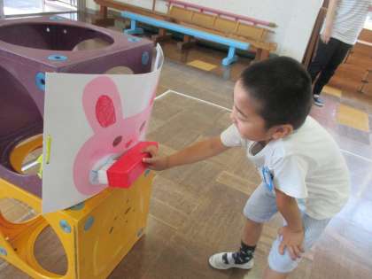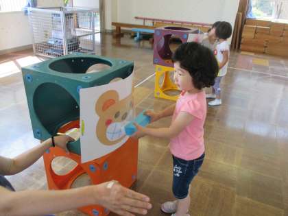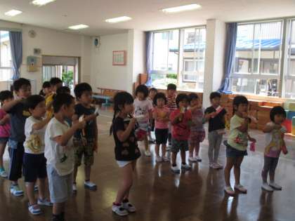 歯磨き集会をしました。歯ブラシの使い方や歯磨きの仕方を確認し、紙芝居を見て、みんなが作った歯ブラシコップを使って歌を歌ったり、歯磨きリレーをしたりして楽しみました。