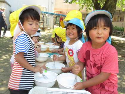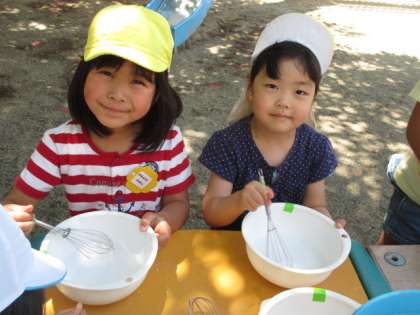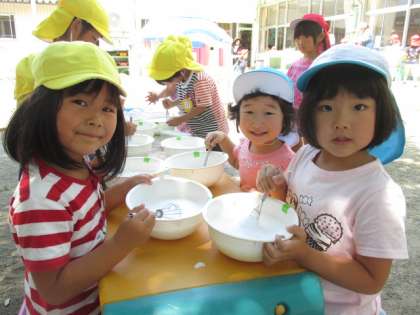 石鹸の泡作りをして遊びました。4歳児の子供たちが石鹸を細かくして遊び出した姿を見て「私もしたい」と、3歳児の子供たちも遊び出しました。初めてする泡遊びでしたが、4歳児の子供たちがやり方を優しく教えてくれました。たくさん水を入れて作る子、少しの水で細かな泡を作る子、いろいろな泡が完成しました。遊びを通して水の調整をしながらいろいろな泡を作って遊んでいきたいと思います。