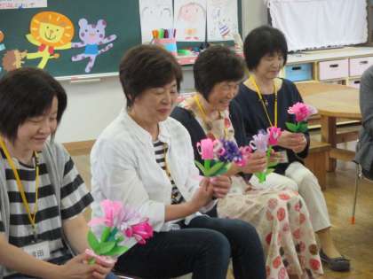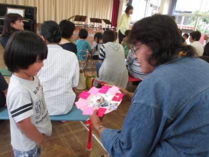 一緒に記念写真撮りました。すぐに、写真カードにして、プレゼントしました。年長児はお花も一緒にプレゼントしました。