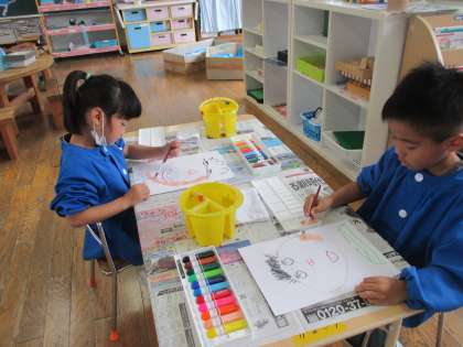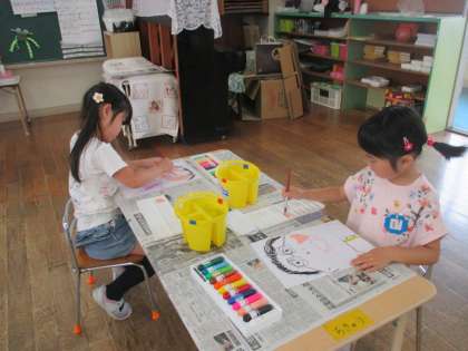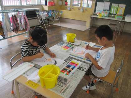 先日描いたお父さんの顔に、絵の具で色を塗りました。絵の具の量と水の量のバランスが難しいようですが、お父さんの顔を思い出しながら丁寧に色を塗っていました。