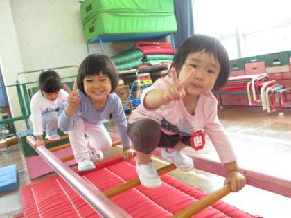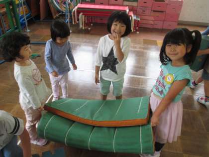 今日は、年長組さんと一緒にサーキット遊びをしました。はしごや一本橋を渡ったり、滑り台をつなげて滑ったりして楽しみました。年長組がはしごを立って渡っている姿を見て挑戦している子もいました。準備や片付けもみんなで協力して行いました。