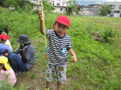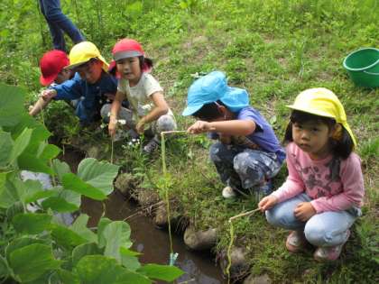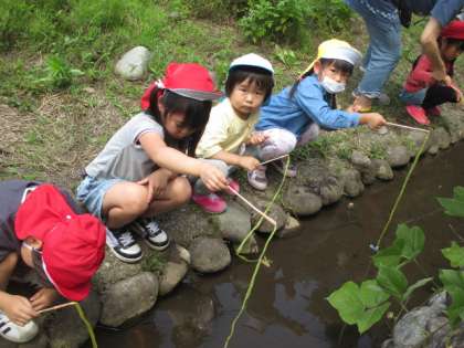 近くの小川には、びっくりするほどたくさんのザリガニが…!「先生!ここに大きいのいる!」「あっ!ここにもいる!」と子供たちは大興奮!さっそく釣り竿にイカソーメンををつけて、ザリガニ釣りをしました。おなかをすかせたザリガニは、すぐに飛びついてきて、たくさんのザリガニを捕まえることができました。「やったー釣れた!」と子供たちは大喜びでした。これからみんなで大事にお世話して成長を見守っていきたいと思います。