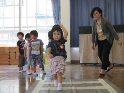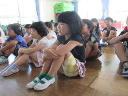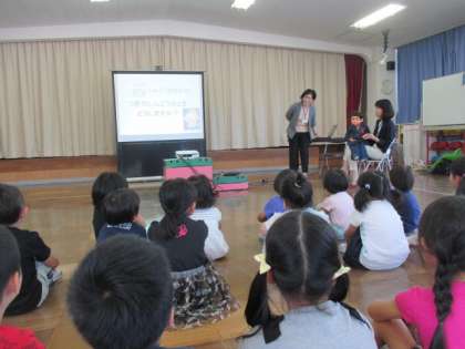 今日は、富山市生活安全交通課の方が来てくださり、交通安全についての話を聞きました。映画では、横断歩道がある所とない所ではどのように道路を渡るのか、信号はどのように渡るのかを確認しました。また、右見て左見て、もう一度右を見ること、耳でも音を確認することを教えてもらい実際に横断歩道を渡ってみました。