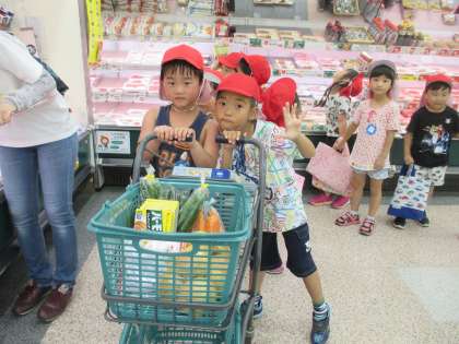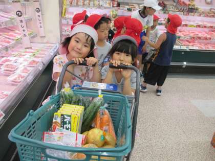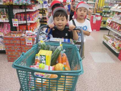 カレーライスの材料をメモをして、スーパーへ買い物に行きました。カートを交代で押しながら、玉ねぎやニンジン、肉など、メモを見ながら、カゴに入れていました。レジを通って、買ったものを、持って行ったバッグに分担していれて「ありがとうございました」とスーパーの方に挨拶をして園に戻りました。明日のカレーパーティが楽しみです。