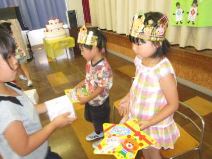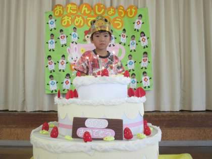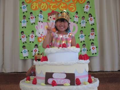暑い7月に生まれたお友達の誕生会をしました。お友達からおめでとうの拍手やお家の人からのメッセージをもらったり、大きなバースディケーキのろうそくを消したりしてお祝いしました。