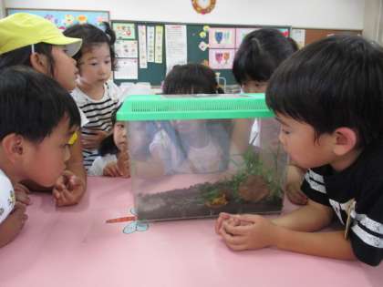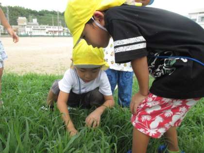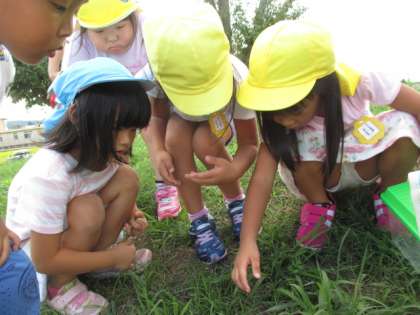 今日は、天気がよかったので幼稚園の近くを散歩してきました。小学校の築山では、子供たちが楽しみにしていた虫探しをしてきました。コオロギやバッタを発見すると「先生いたよ」と、元気に教えてくれました。捕まえた虫に新しいお家を作って飼育しようと話をしています。図鑑を見てエサなどを調べていきたいと思います。
