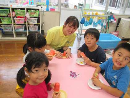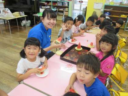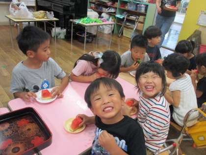 地域の方にスイカをいただきました。大きなスイカを見た子供たちは大喜び!!「はやく食べたい」「スイカ大好き」と、おいしくいただきました。