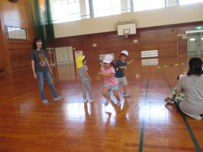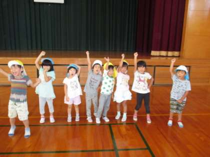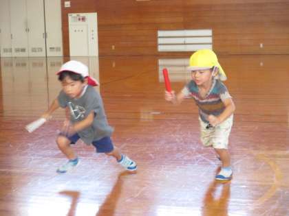 3年齢みんなでリレーをして遊びました。3・4歳児は、5歳児のしているリレーに憧れキラキラの目で走っている姿を見ていました。5歳児の子供たちに「一緒にしてもいい」と聞くと「いいよ」と答えてくれたので、早速やって遊びました。みんなでリレーをして楽しみました。