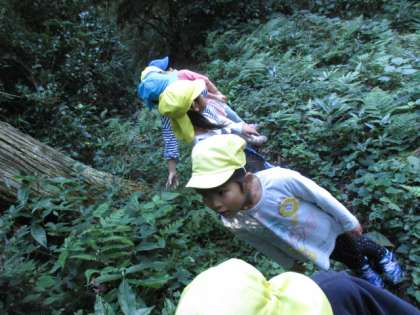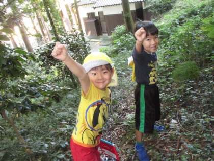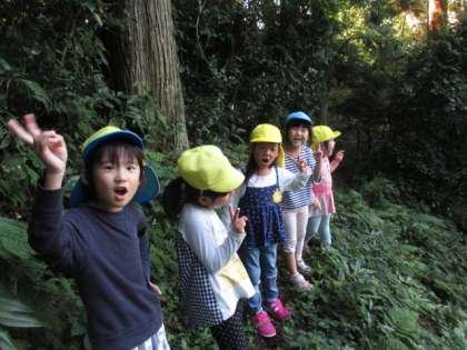 今日は、幼稚園の近くにある稲荷神社まで散歩に行ってきました。神社にあるブランコで遊んだり、裏の山を探検したりしてきました。