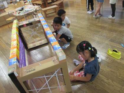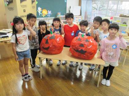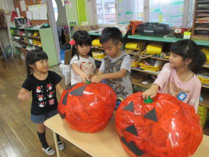 ハロウィンといったらかぼちゃのおばけ。カラーポリ袋にたくさん新聞紙を詰めて形を作り、顔のパーツをつけて完成させました。次はクモの巣トンネル作り。だんだんハロウィンの雰囲気がでてきました。
