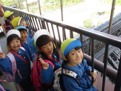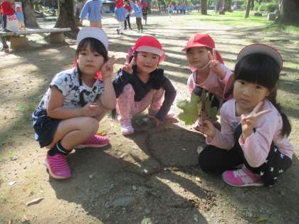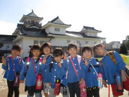 年長児は城址公園で鬼ごっこをしたり、ドングリを拾ったりしました。年少児・年中児は、富山城の中を見学して、展望台まで登りました。