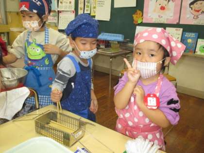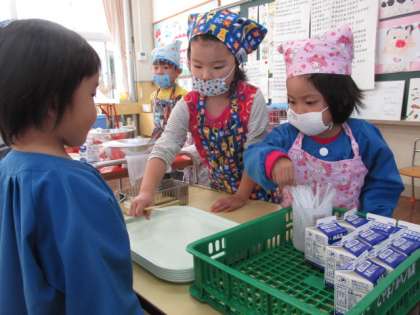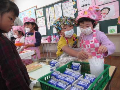 10月から給食当番を始めた3歳児の子供たちは、当番をとても楽しみにしています。4歳児のしている姿を真似したり、牛乳とストロー、お箸をお盆の上に置く仕事をしたりしています。エプロンも自分で準備をし、片付けもしています。困ったときは、4歳児の子供たちが優しく教えてくれています。みんなで協力して給食当番を頑張ります。