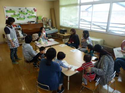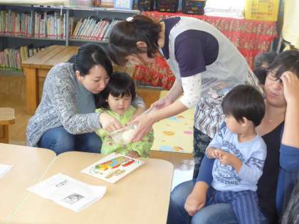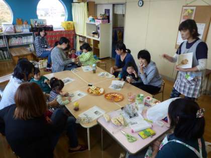 講師を招き、簡単にできるお家パンづくりをしました。講師から材料やつくり方を教えてもらい、実際にこねたばかりの生地と発酵させた生地の両方を触ってみました。子供たちやお家の方々は、「おばけナン」や「かぼちゃパ」など優しい味のパンを食べてみました。身近な材料でしかも無添加で、簡単につくることができ、お母さんたちに好評でした。来週は、県総合運動公園までお散歩に出かけます。