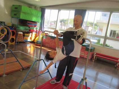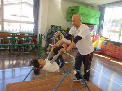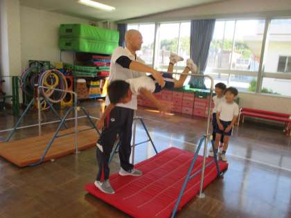 体操教室で鉄棒をしました。前回りや足抜き回り、腰抜き回りなどいろいろな技の練習をしました。3・4歳児はぶら下がり対決や床に手をついてのコオモリ下り、5歳児は懸垂対決やコオモリ下りにも挑戦しました。