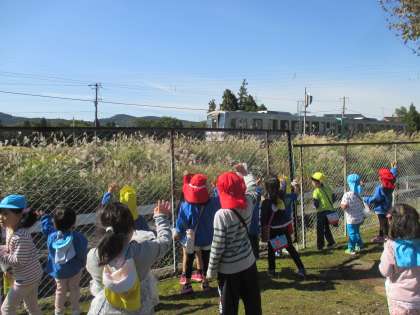 今日は、とてもよいお天気だったので、みんなで北銀グラウンドまで散歩に行ってきました。ドングリ探しをしたり、高山線の電車を見たりして楽しんできました。