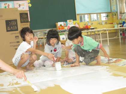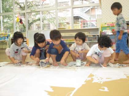3・4歳児の子供たちは、忍者ごっこを楽しむために準備を進めています。子供たちと、どのような修行をしたいかを考え、遊びに必要な物をつくっています。お城、隠れの術をする落ち葉や草など少しずつつくっています。