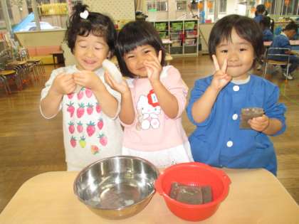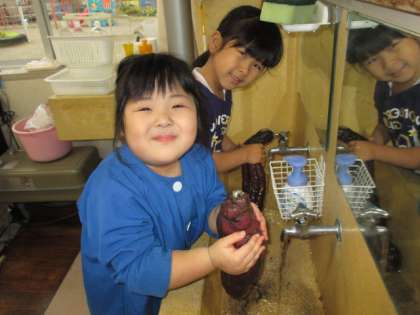 3・4歳児の子供たちもお手伝いをしました。野菜を洗ったり、こんにゃくをちぎったりしました。