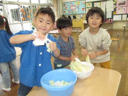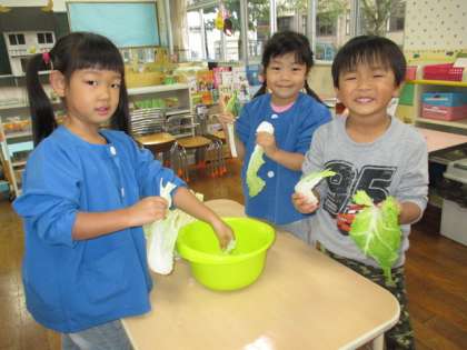 白菜もちぎりました。子供たちは、準備ができた野菜を年長さんに「お願いします」と届けました。
