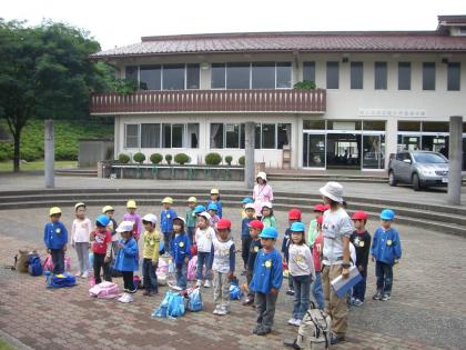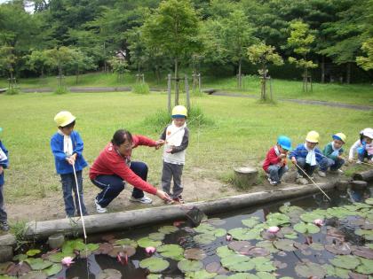 年長児が呉羽青少年自然の家へ行ってきました。心配していたお天気も上々で、さわやかな夏空のもと、戸外遊びを存分に楽しみました。ザリガニ池でのザリガニ釣りでは釣れる度に歓声があがり、お昼ご飯を食べる時間になってやっと終了にしたほどみんな夢中になっていました。なんと6匹も釣ったお友達もいましたよ。お腹を空かせて食堂で食べたお子様ランチもおいしくてカレーをおかわりをするお友達もたくさんいました。食後は、飛行機を作って飛ばして遊んだり、三楽池の周りを探検したりしてきました。退所式で所長さんは、「今度お家の人とまた来てくださいね。」とおっしゃっていました。子ども達は疲れた様子も見せず、楽しかった思い出を帰りのバスの中でも語り合っていました。子ども達にとっては、とても貴重な体験だったようです。