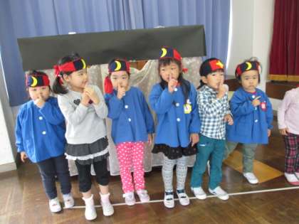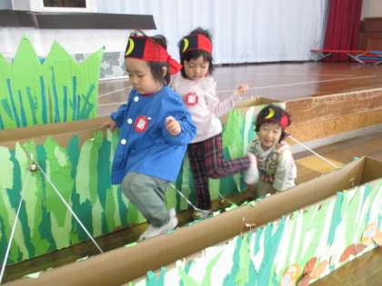 たんぽぽ・ひまわりぐみの子供たちは、毎日大好きな忍者ごっこを楽しんでいます。横走りの術、隠れ身の術・忍びの術など「音を立てずにそーっとそーっと」と言いながらいろいろな忍術の修行を頑張っています!!