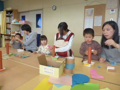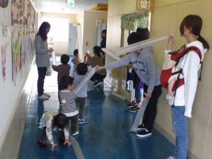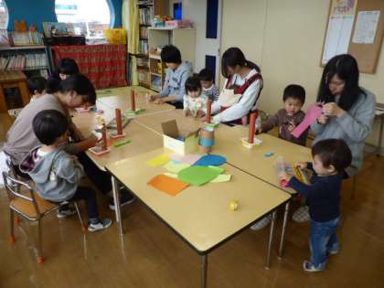 今日は簡単なおもちゃづくりをしました。リスや自分の好きな動物がドングリをコロコロと落とすおもちゃと長い風船づくりです。ドングリ落としは、お母さんたちがスムーズに落ちてくるように、角度を調節してくれ、子度たちは何度も楽しみました。長い風船は、飛ばしたり、剣みたいに戦いごっこをしたりして遊びました。どれも身近にある材料でできるので、お母さんたちにも好評でした。