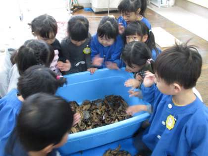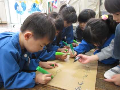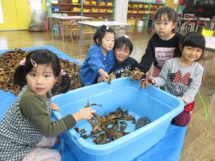 気温も低くなり、カメさんも少しずつ動かず、石の上で休んだり、餌を食べなくなったりする姿が見られたので、先日みんなで拾った落ち葉をカメさんの家に入れて冬眠の準備をしました。「春になったらまた会おうね」と、声をかけていまた。カメさんが冬眠していることがわかるように、カメの家に「カメさんとうみんちゅう」と看板もつけました。