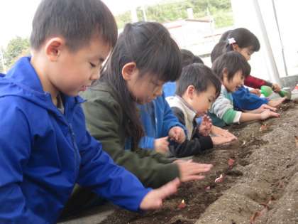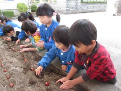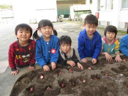 今日は、花壇にチューリップの球根を植えました。「どんな色のチューリップが咲くかな」「大きくなってほしいね」「可愛く咲いてね」と、声をかけながら植えていました。友達と♪チューリップ♪の歌を歌いながら植える姿が可愛かったです。