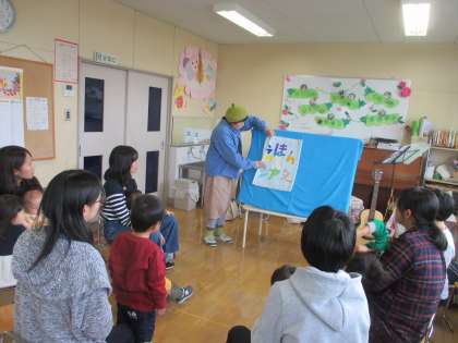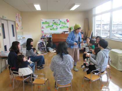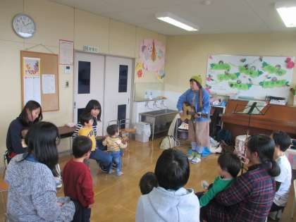 講師を招き、親子で歌遊びをしました。ウクレレやギターに合わせて歌を歌ったり、パネルシアターでクイズ遊びをしたりしました。心地よい温かい歌に包まれながら親子で触れ合いを楽しみました。明日は10時から「なかよし発表会」が始まります。親子サークルの子供たちの出演時間は10時半ごろの予定です。10時20分までに遊戯室に集まってください。