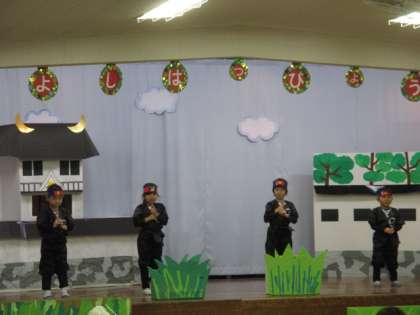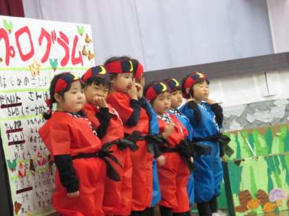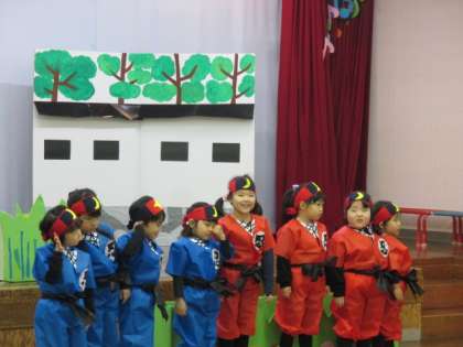 3・4歳児は「ちびっこ忍者」の劇をしました。たのしく修行している姿をお家の方に見てもらいました。なぞなぞにも答えていただきまして、ありがとうございました。