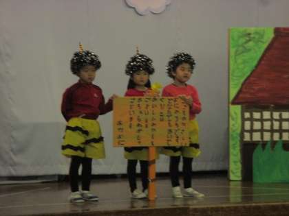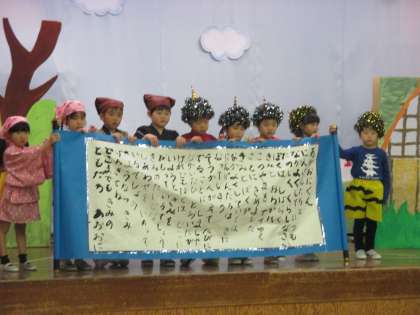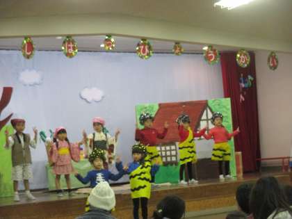 5歳児は「ないた赤おに」の劇をしました。大きな声で台詞を言う姿は、とっても立派でした。