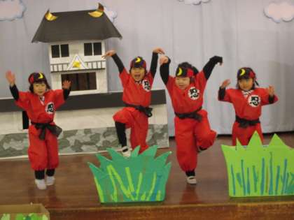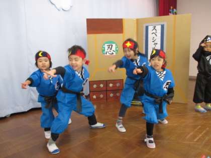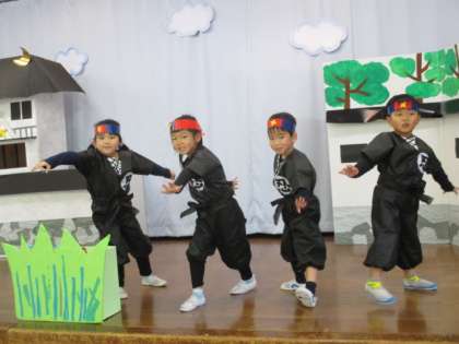 今日は、今まで遊んできた役とは違う役になって劇遊びを楽しみました。「今日は、手裏剣忍者になる」「どくたけもしたいな」と、衣装を着て忍者になりきって修行をしました。