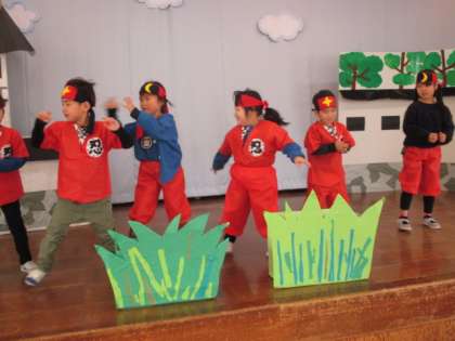 お誕生会のお楽しみ会では、なかよし発表会で披露した「ちびっこにんじゃ」と「ないた赤おに」の劇遊びをみんなで楽しみました。今日は自分の好きな役になり、衣装をつけて、歌を歌ったり踊ったり…登場する場面や動き、お友達が言ったセリフもよく覚えていて、上手に演じている子供たちでした。