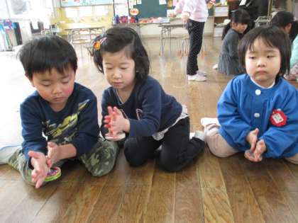子供たちは、こま回しに挑戦しています。上手く回せるようになりたいと、何度も挑戦して頑張っています。